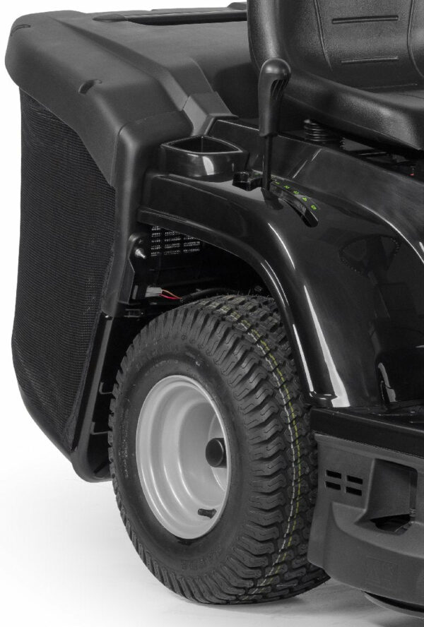 Este tractor facilita el mantenimiento del césped, ahorrando tiempo gracias a su potencia, grandes ruedas y radio de giro de 180 cm. La marcha atrás y su maniobrabilidad permiten trabajar cómodamente alrededor de obstáculos.